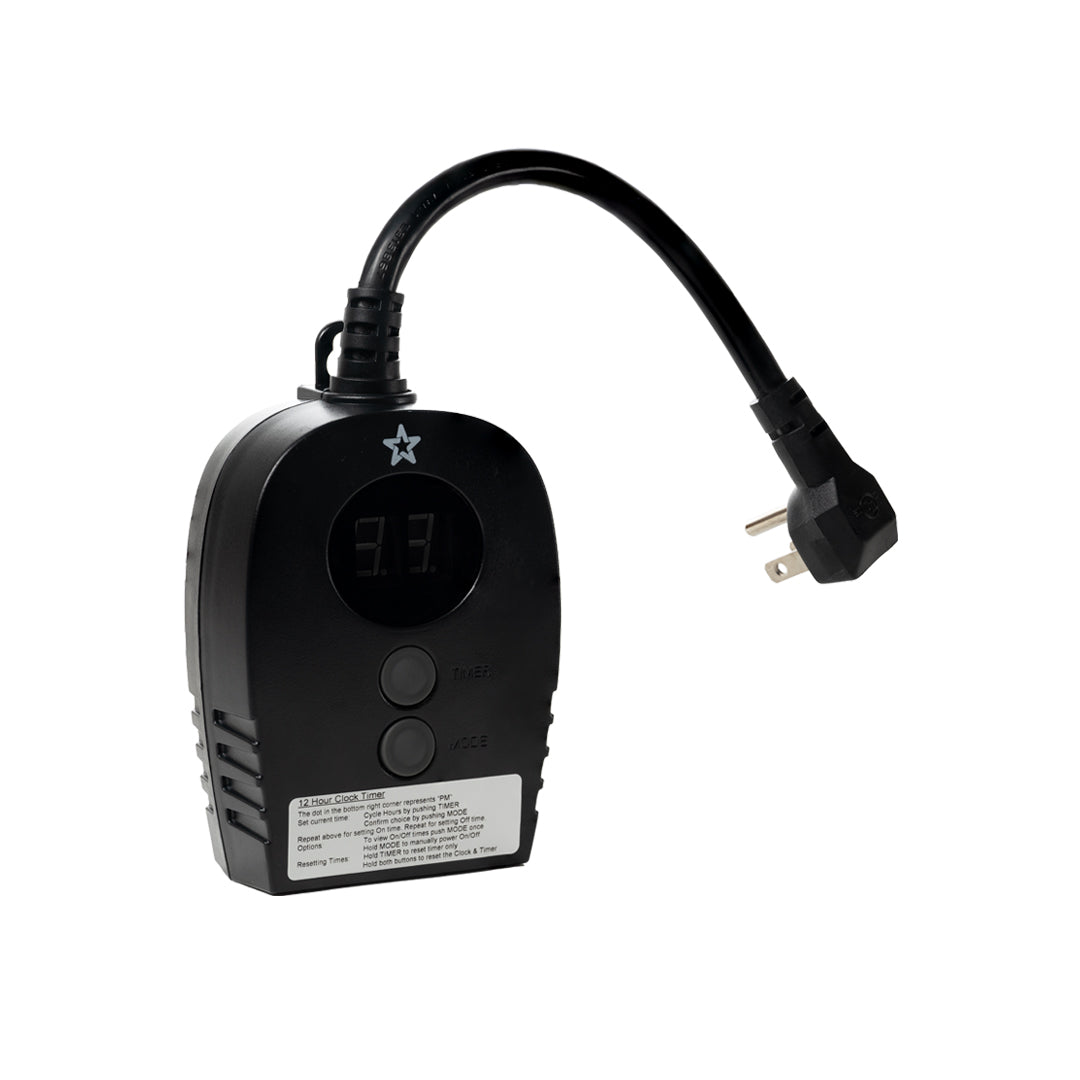 A no-fuss outdoor Christmas lights timer, trusted by professionals. Its simple 12-hour clock is easy to set, and includes waterproof instructions for convenience. In case of a power outage, the internal backup battery retains your settings. Featuring two outlets in opposite orientations, this timer will accommodate zip plugs with wires in either direction.