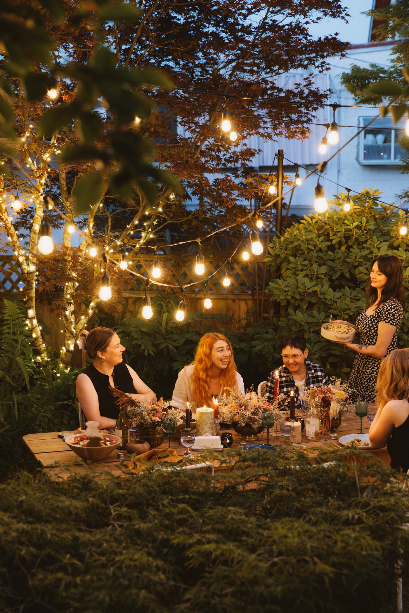 String lights make trees, bushes, and hedges glow. Wrap trunks and branches, weave through shrubs, or outline garden beds for a soft, even sparkle that feels warm and welcoming.